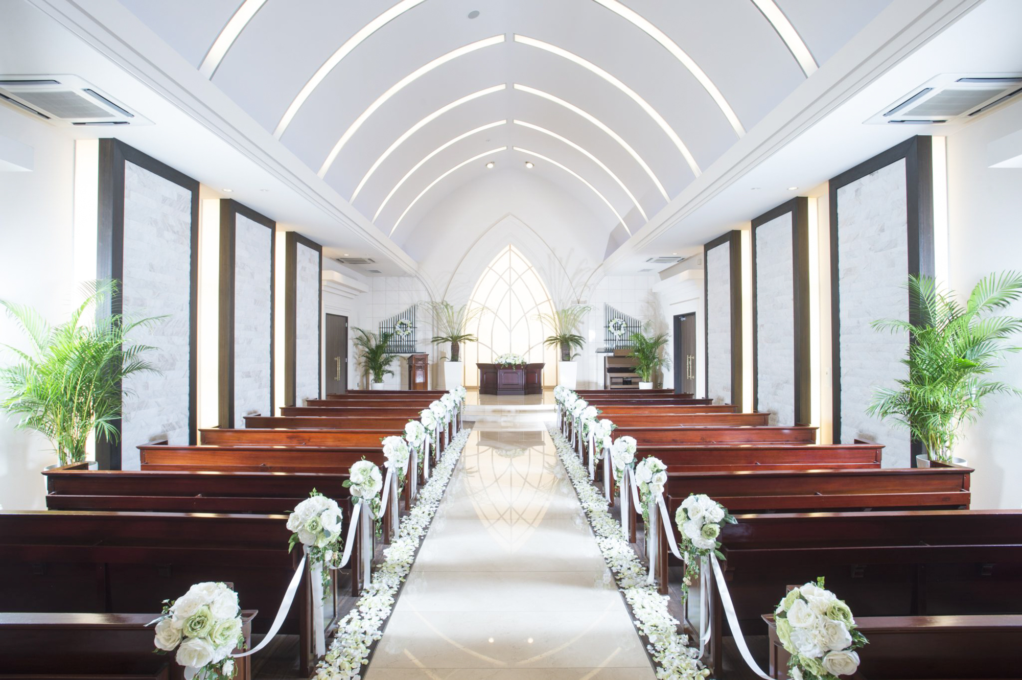 格式あるインテリアと自然光、照明も美しいチャペル。